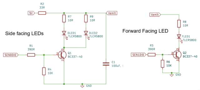 Below are the circuit that drive the LEDs. On the left, the circuit for the two diagonal side wall facing LEDs and on the right the circuit for the single forward facing LED